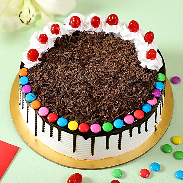 Treat yourself to a delightful Black Forest cake, beautifully decorated with colorful gems. This delicious creation features a creamy texture and the classic Black Forest flavor you love. Perfect for celebrations or simply satisfying your sweet tooth, this cake is sure to bring a smile to your face.