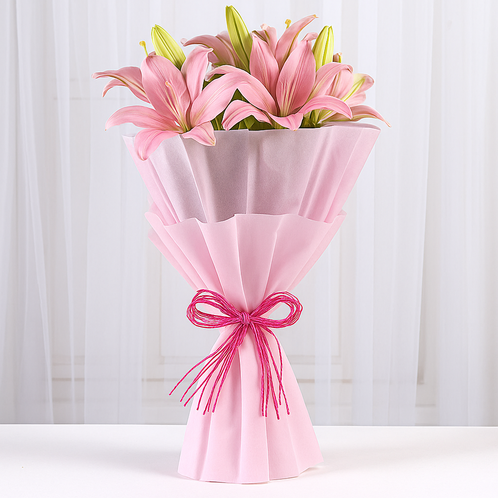 Express your heartfelt emotions with our Admirable Pink Lilies Bouquet. This exquisite arrangement showcases the delicate beauty of pink lilies, perfectly complemented by the lush greenery of Morpankhi fillers. The bouquet is carefully wrapped in pink non-woven paper and tied with a charming pink raffia, creating a visually stunning and elegant gift.