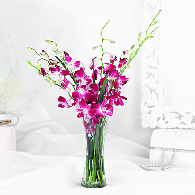 Bring a touch of elegance to any occasion with this stunning Purple Orchid Vase Arrangement. This exquisite bouquet features five fresh, vibrant purple orchid stems, artfully arranged in a vase. The lush Green Dracaena Leaf fillers add a touch of natural beauty, creating a captivating display that will brighten any room.